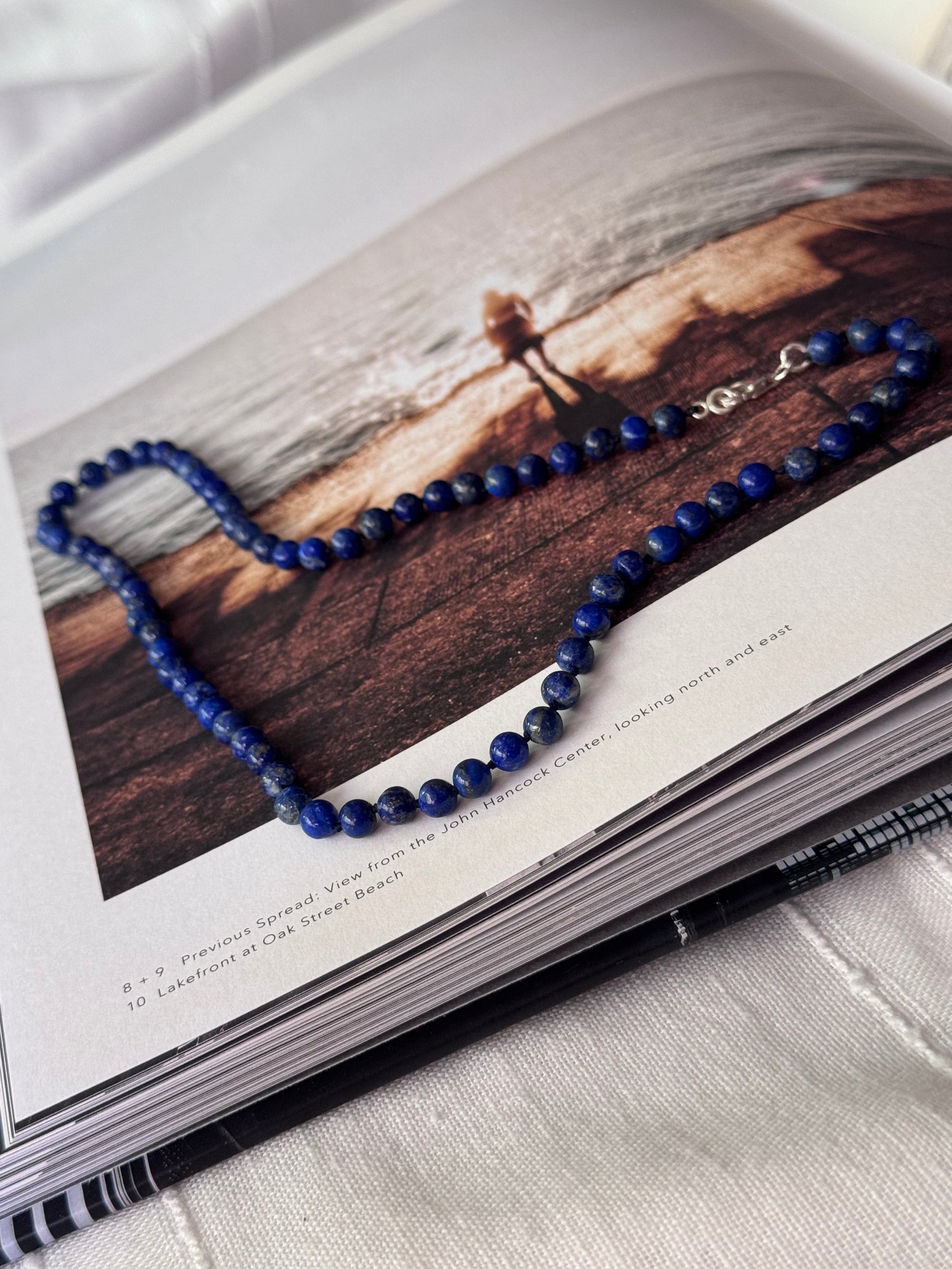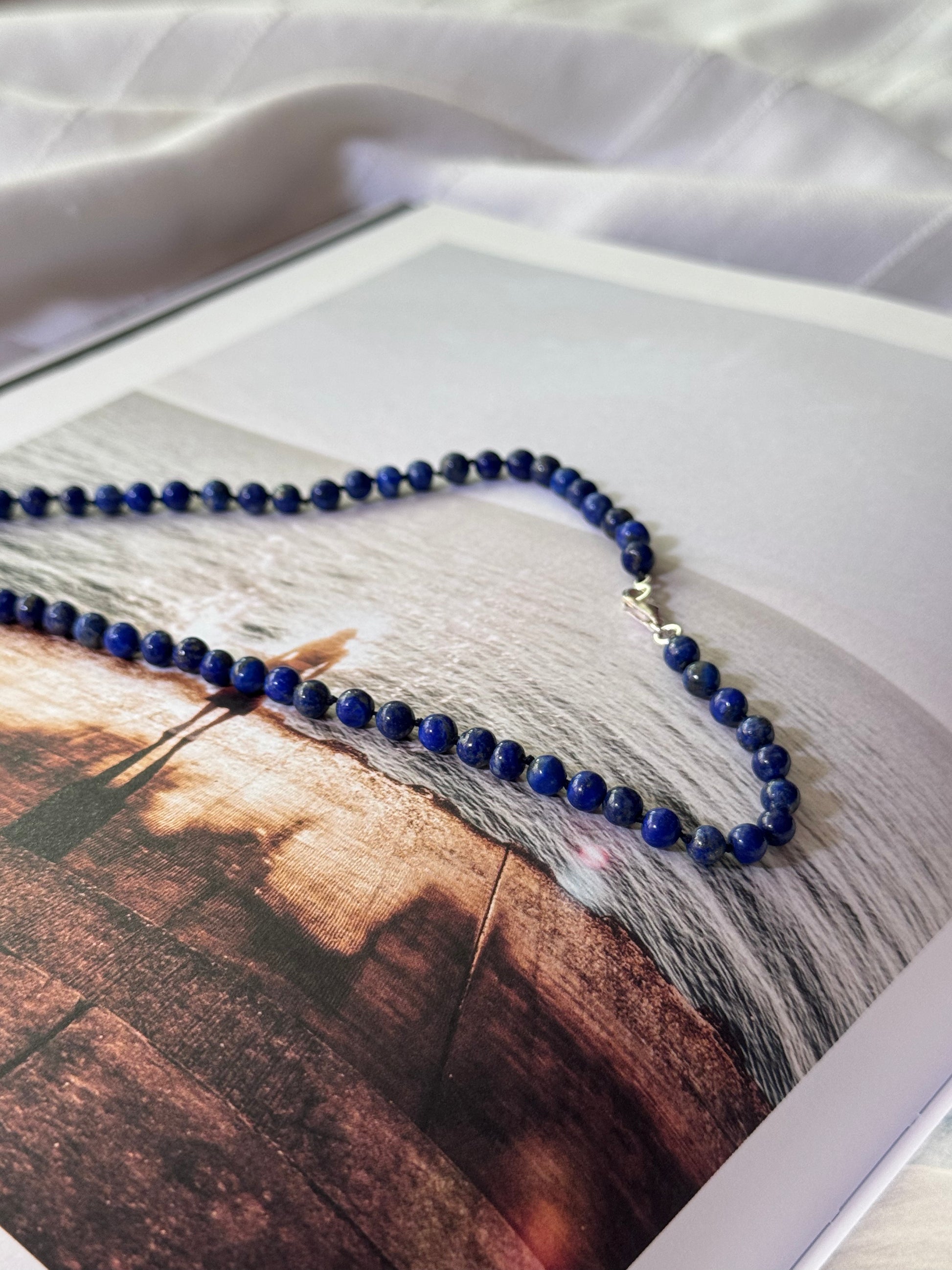 Collar de Lapislázuli engarzado en hilo con broche de plata. Medida 39 cm.