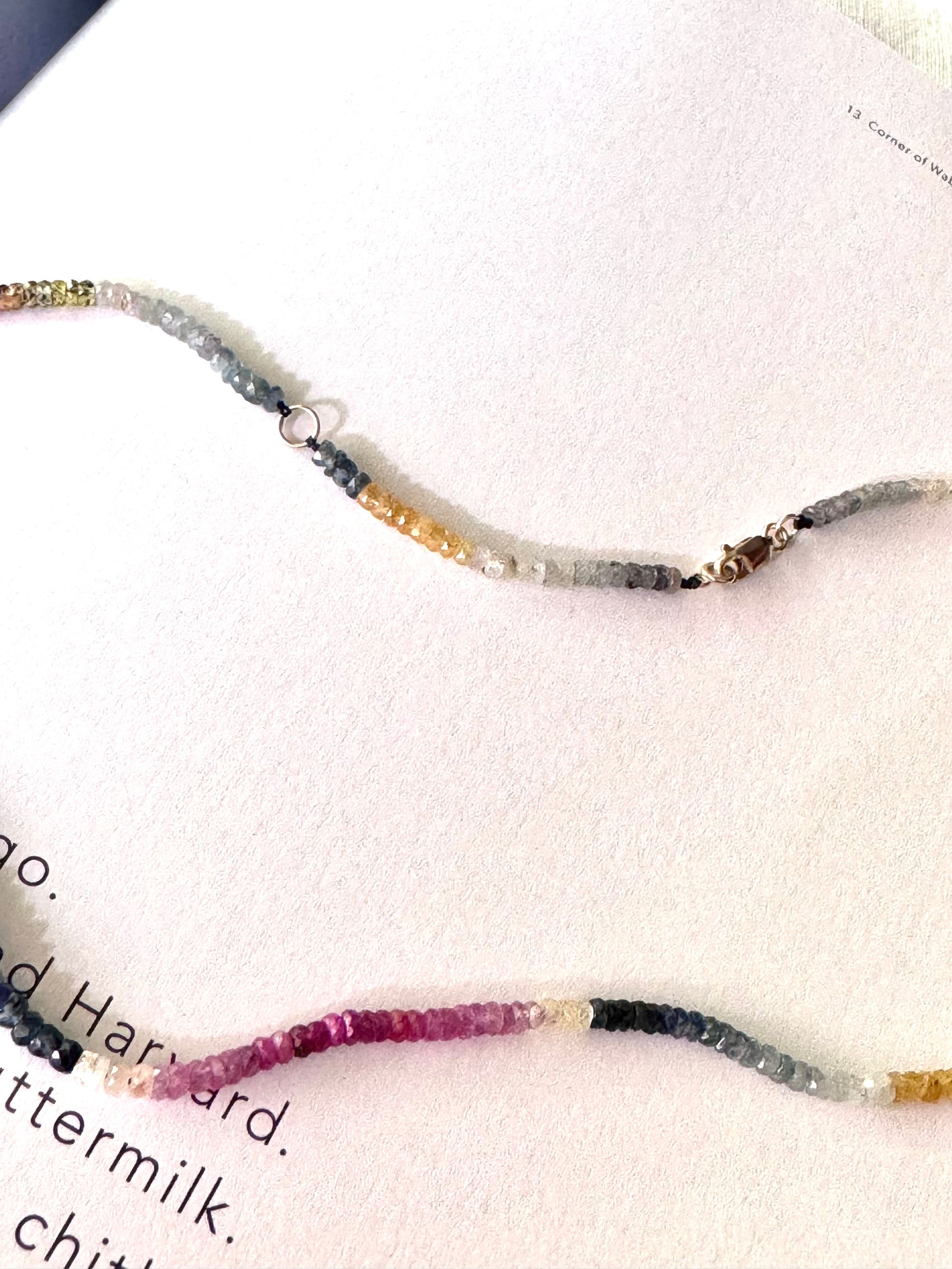Collar de Zafiros de colores con broche de oro de 10k con extensión para ser usado largo o corto. Medidas 41 cm y 47 cm. Engarzado en hilo.